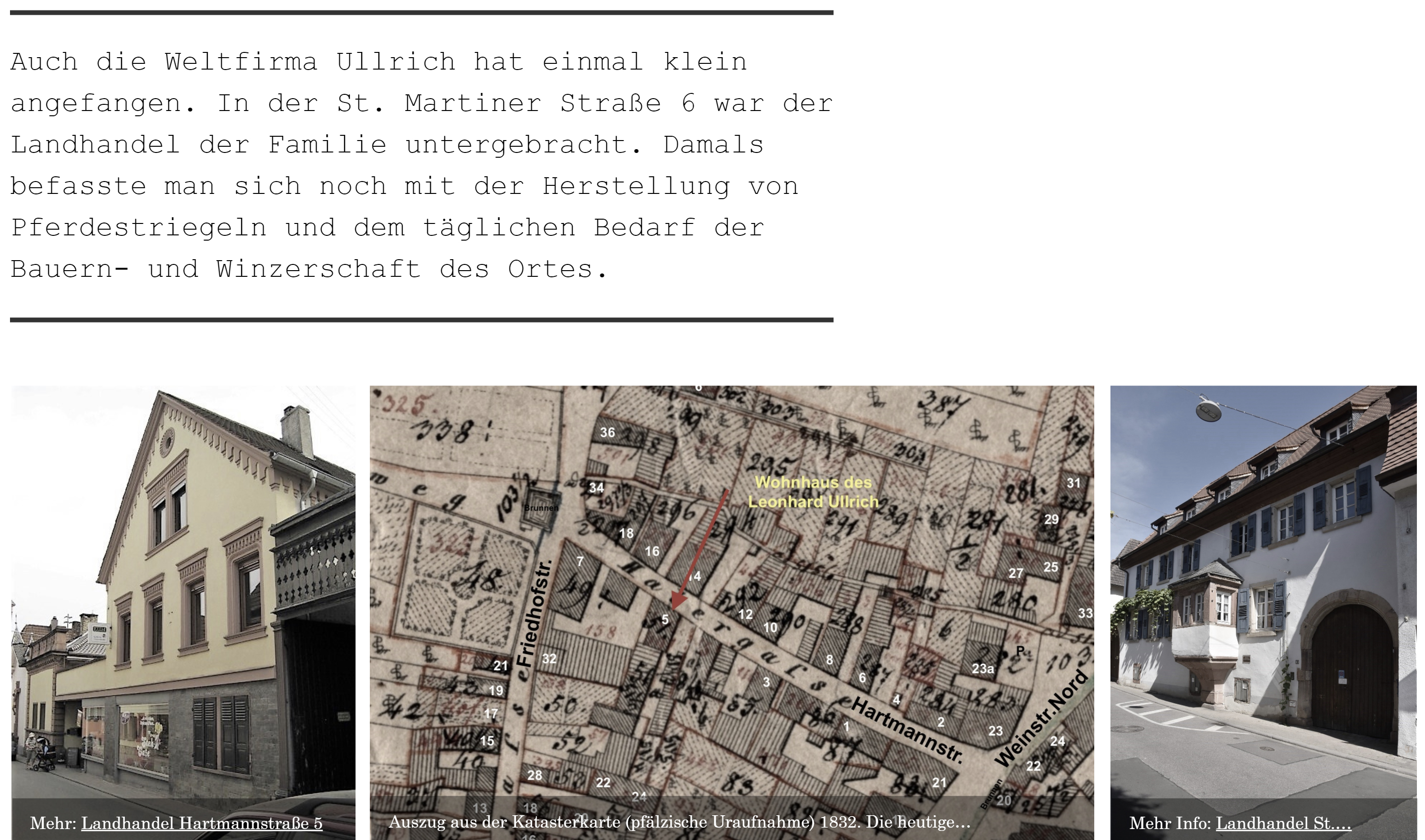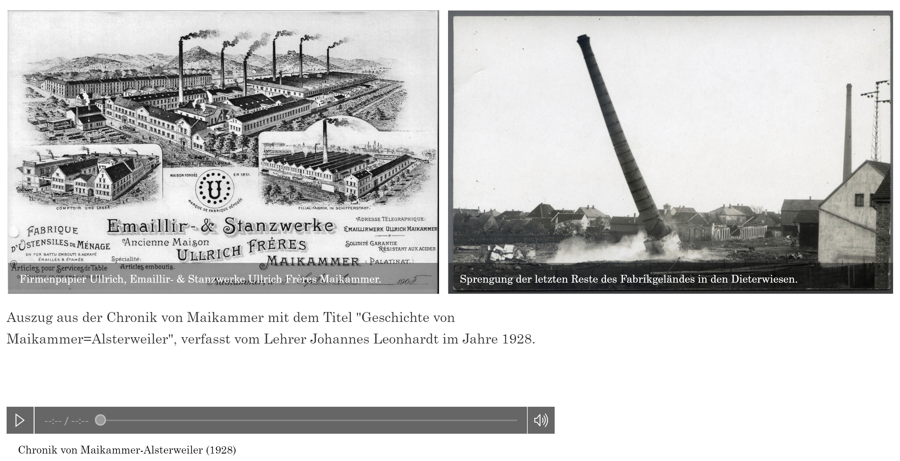 Bei der Industriegeschichte Maikammer wird eine Audio-Datei zusätzlich angeboten, die es so in den KuLaDig-Einträgen nicht gibt. Kommerzienrat August Ullrich schilderte dem Maikammer Chronisten und Schullehrer Johannes Leonhardt etwa in den 20er Jahren des 20. Jahrhunderts seine Sicht auf die Emaillierwerke Gebrüder Ullrich. Dieser Text wurde maschinell eingelesen und ergänzt nun die Geschichte am Ende, wie ein kleiner Abspann. „August Ullrich“ lässt die Firmengeschichte nochmals Revue passieren. Das ist eine grundsätzliche Überlegung, ob man neue Aspekte in der Geschichte einführen möchte.