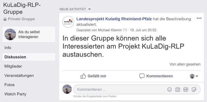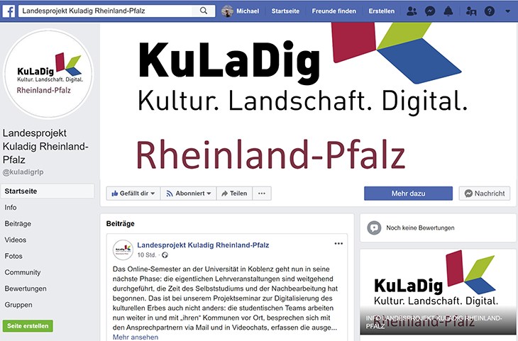 Also: Schauen Sie mal vorbei, liken Sie uns, treten Sie der Gruppe bei, und wir können den Austausch zum Projekt, zu KuLaDig und allgemein zum kulturellen Erbe in Rheinland-Pfalz weiter intensivieren. Wir freuen uns darauf.