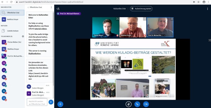 Am heutigen Vormittag fand der Kommunalkongress 2020 erstmalig als komplett digitale Veranstaltung statt. Ausgerichtet wurde der Kongress durch das Ministerium des Inneren und für Sport des Landes Rheinland-Pfalz in Unterstützung durch die KL-digital GmbH. Nach der Begrüßung durch den Oberbürgermeister der Stadt Kaiserslautern, Dr. Klaus Weichel sowie einführenden Worten zu Digitalisierungsbestrebungen in Rheinland-Pfalz durch Innenminister Roger Lewentz, konnten die TeilnehmerInnen zwischen 12 Workshops zum Thema Digitalisierung in Rheinland-Pfalz wählen. Die eine Stunde andauernden Workshops wurden in zwei Durchgängen angeboten. Auch unser Projekt war auf dem Kommunalkongress vertreten: Prof. Dr. Michael Klemm stellte als Projektleiter die Arbeit von KuLaDig-RLP vor, skizzierte die Bandbreite der unterschiedlichen Teilprojekte hinsichtlich der inhaltlichen und technischen Umsetzungen.