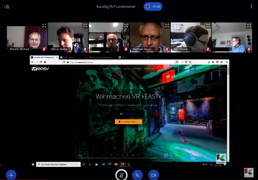 Neben dem aktuellen Vorhaben, das Veldenzschloss in Lauterecken in seiner ursprünglichen Gestalt zu visualisieren, wurde im weiteren Verlauf des Webinars anhand eines 3-D-Rundgangs dargestellt, wie Orte und Räume auch ohne VR digital erfahrbar gemacht werden können. Das interaktive Erkunden eines Museumsraumes, in dem neben Bilddateien auch Videoclips, KuLaDig-Objekte und Audios hinterlegt sind, bietet kleineren (Orts-)Museen eine breite Sichtbarmachung des eigenen Bestandes.