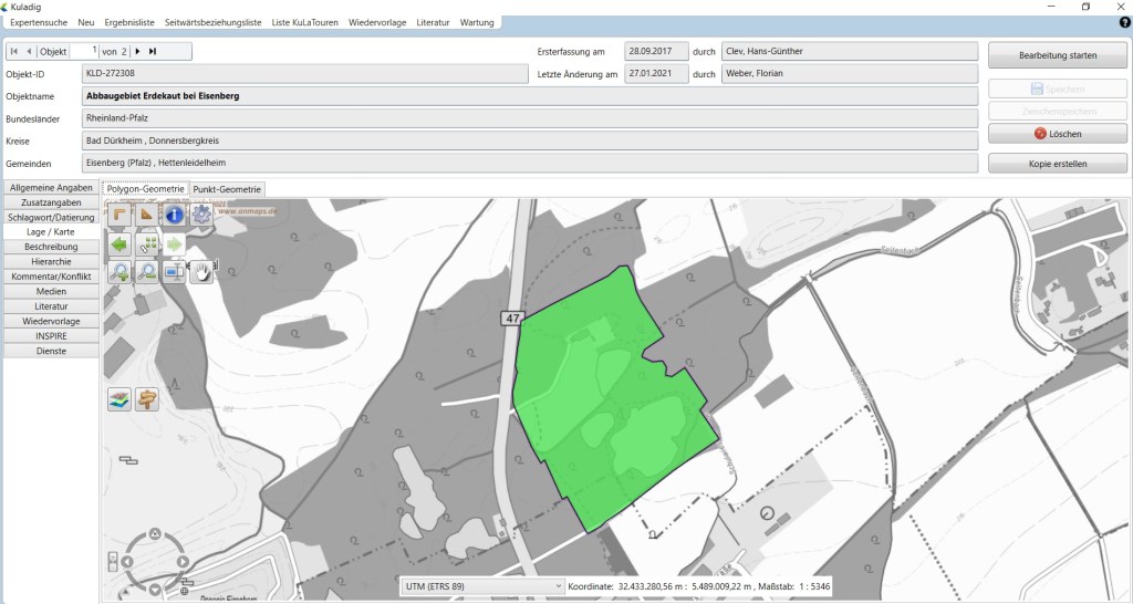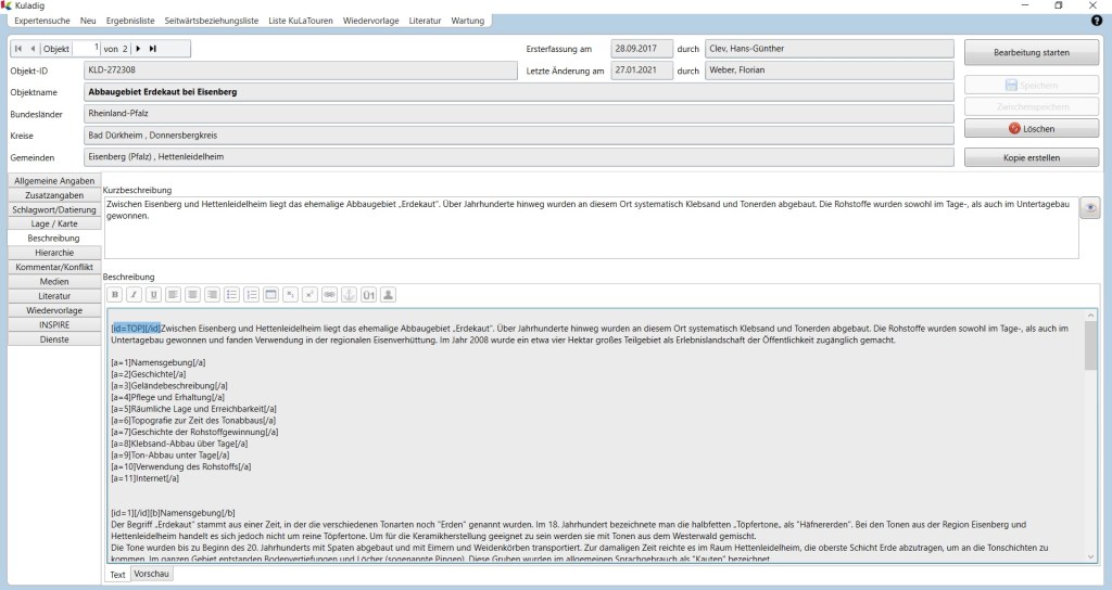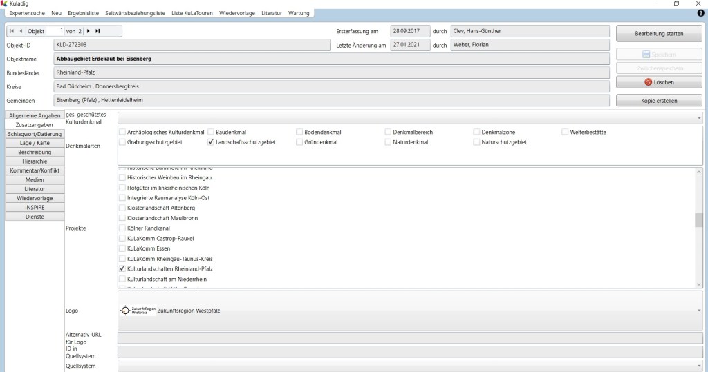 Aus der Landescloud werden die einzelnen Objektbeiträge in die Datenbank von KuLaDig überführt und in dieser gibt es eine Vielzahl von Datenfeldern die mit Metadaten ausgefüllt werden müssen und Häkchen die gesetzt werden müssen. So müssen beispielsweise neben der Objektbenennung die vollständige Adresse des Objekts, die Art und Weise der Datenerfassung sowie mögliche Eintragungen in die Denkmallisten der GDKE festgehalten werden. Dabei kommt es immer ganz darauf an, um welche Art Objekt es sich handelt.