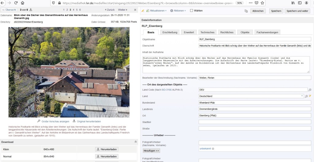 Im nächsten Arbeitsschritt werden nun die Medien im MediaFiler hochgeladen und mit den erforderlichen Metadatenfeldern versehen. Besonders wichtig sind hier die Felder zur Urheberschaft, zum Bildtitel und -inhalt, aber auch die Verschlagwortung und die Felder im Reiter „Rechtliches“ sind wichtig. Im letzten Reiter „Fachanwendungen“ erfolgt über die KuLaDig-ID (den letzten Teil jeder KuLaDig-URL) die Verknüpfung zum Objekt. Erfasst werden die Metadaten im eigenen Ordner. Nachdem die Daten eingefügt wurden, muss das einzelne Medium einen Workflow durchlaufen, der aus drei Ebenen besteht. Jede Ebene hat ein automatisches Prüfsystem. Nicht ausgefüllte Felder werden automatisch angezeigt. In der Endabnahme erfolgt dann das „Vier-Augenprinzip“. Eine zweite Person prüft die ausgefüllten Daten.