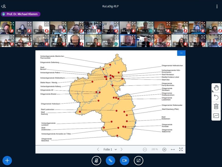 Jetzt kann es losgehen: Mit einem virtuellen Treffen von knapp 30 Aktiven aus den neuen Modellkommunen mit dem Projektteam ist am 1. März das dritte Projektjahr in seine operative Phase eingestiegen. Während der zweistündigen Video-Konferenz auf der Plattform BigBlueButton lernten sich die Hauptakteure der künftigen Teilprojekten untereinander kennen. Deutlich wurde, wie vielfältig und spannend die Rahmenthemen auch in diesem Jahr sein werden. Das Projektteam vermittelte zudem einen ersten Eindruck von der Struktur des Landesprojekts und dessen bisherigen Ergebnissen, vom Informationssystem KuLaDig und vom weiteren Vorgehen in den kommenden Wochen. Nicht zuletzt wurden erste Impulse hinsichtlich der Verwertung von KuLaDig-Inhalten gegeben, da die Verwertung eines Objektbeitrags auch dessen Gestaltung beeinflusst.