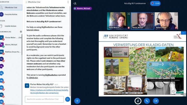 Dieses Jahr fanden unsere zwei Informationsveranstaltungen für die zehn neuen Kommunen komplett digital statt. Den kommunalen Teams, in denen VertreterInnen aus der Administration, dem Tourismus und „WissensträgerInnen“ verschiedenster Art zusammenarbeiten, wurden grundlegende Informationen zum Informationssystem KuLaDig, zu den KuLaDig-Aktivitäten in Rheinland-Pfalz sowie zum Ablauf des dritten Projektjahrs vermittelt. Insbesondere wurde erläutert, welche konkrete Unterstützung die Kommunen bei der Durchführung ihrer Teilprojekte durch das Projektteam und die Studierenden der Universität Koblenz-Landau erhalten und welche Mitarbeit die kommunalen Teams leisten. Auch wurden erste Ideen zur Verwertung der künftigen Beiträge in den Kommunen entwickelt.