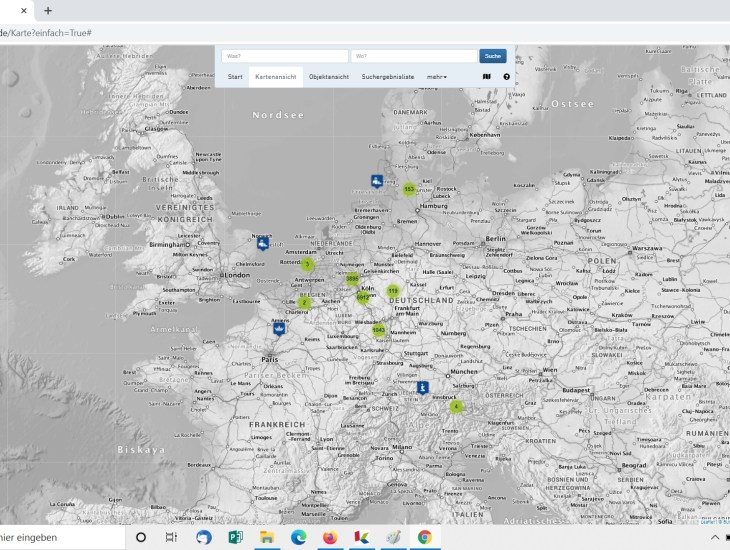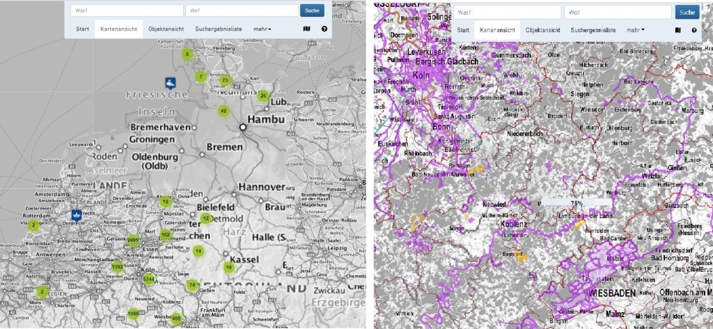 Die „Was- und Wo-Suche“ ermöglicht wie bisher eine gezielte Suche nach Objekten. Dabei ist zu beachten: je allgemeiner die Suche angelegt ist, desto vielfältiger fällt das Suchergebnis aus. Eine Punktverortung (Ziffern) zeigt an, wie häufig die Suchanfrage als Objekt in der jeweiligen Region verbreitet ist. Ein Klick auf diese Punktverordnung ermöglicht das Hineinzoomen auf die nächste Ebene. Nach und nach werden auf den folgenden Ebenen die einzelnen Objekte angezeigt.