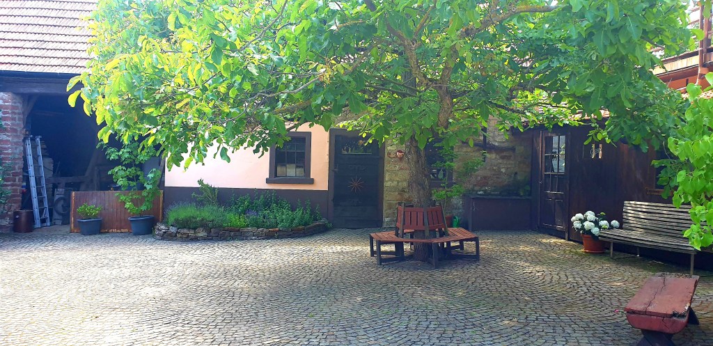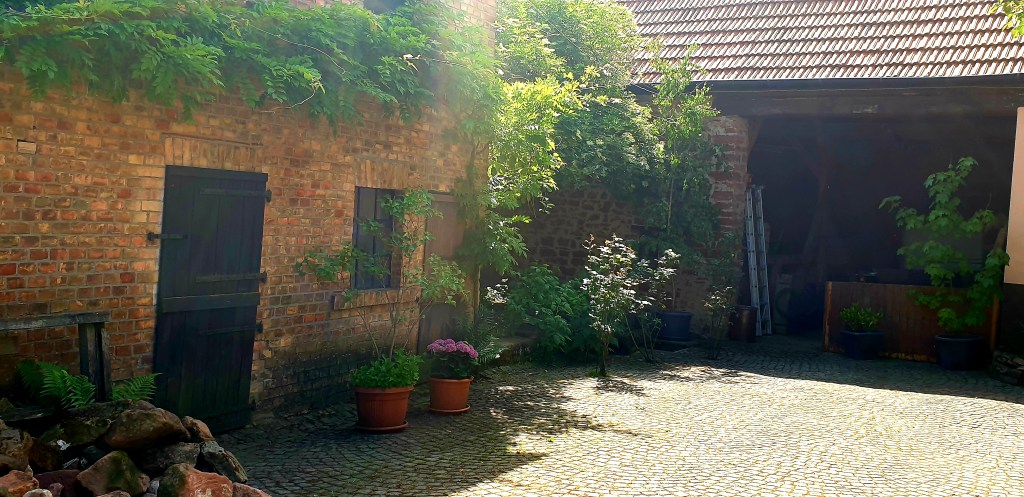 Von der Hauptstraße aus ist die stattliche Stirnseite des Hauptgebäudes in Fachwerkbauweise mit rosafarbenen Gefachen und Krüppelwalmdach zu sehen. Dass sich hinter der Mauer und dem Tor aber ein pittoresker Innenhof befindet, der von Haupthaus, Scheune und Stallgebäude zu drei Seiten eingerahmt ist, bleibt den neugierigen Blicken verborgen. Oder besser gesagt, blieb den neugierigen Blicken bislang verborgen. Denn im zweiten Projektjahr ging es im Teilprojekt Weitersweiler auch darum, Blicke hinter die Mauern und Tore der Weitersweilerer Kulturlandschaftsobjekte zu ermöglichen. Das Objekt ist eins von zehn KuLaDig-Objekten im Ort und ebenfalls Bestandteil des 26 Stationen zählenden Wambold-Nassauer-Weges. Dieser wurde durch den engagierten Historischen Arbeitskreis Weitersweiler ins Leben gerufen, um Einheimischen wie BesucherInnen gleichermaßen die vielseitige Vergangenheit der Ortsgemeinde zu vermitteln.