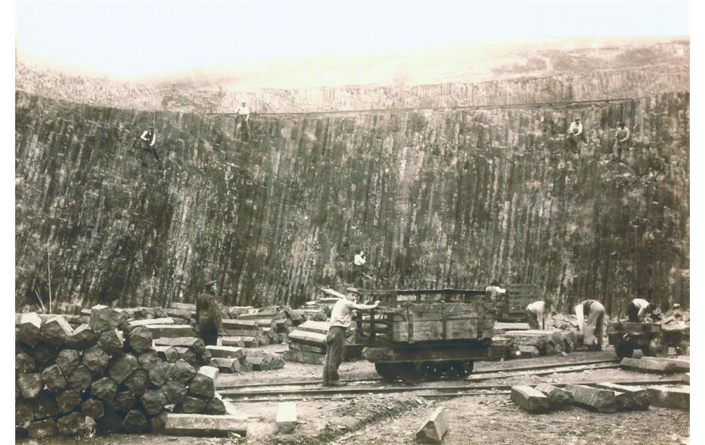 Die Ortsgemeinde Dattenberg oberhalb von Linz am Rhein war über hundert Jahre stark durch den Abbau des heimischen Basaltsteins geprägt. Der Steinbruch, nur wenige hundert Meter nördlich des alten Ortskerns gelegen, diente Generationen von Dattenbergern als krisenfeste Arbeitsstelle. Ein erster punktueller Abbau erfolgte nachweislich bereits durch die Römer. Auch für den Bau der gleichnamigen Burg wurde im Mittelalter der heimische Stein verwendet. Zur Mitte des 19. Jahrhunderts aber setzte ein kontinuierlicher Abbau in Dattenberg ein. Neben Bauwerken, hier beispielsweise die Neubefestigung der Stadt Köln, kam der Rohstoff im Rahmen der deutschen und niederländischen Uferbefestigungsmaßnahmen zum Einsatz. Der Dattenberger Basalt wurde mit Pferdewagen zur Verladestelle am Rhein transportiert, die etwa 800 Meter Luftlinie und vom Steinbruch entfernt lag. Im Jahr 1888 löste die Bremsbahn die Pferdewagen ab und beförderte das schwere Material die etwa 130 Höhenmeter vom Steinbruch hinunter zum Fluss. Im Jahr 1978 wurde der Steinbruch in Dattenberg geschlossen. Die Natur hat das Areal mittlerweile zurückerobert, unmittelbar an der Abbauwand hat sich ein kleiner See gebildet.