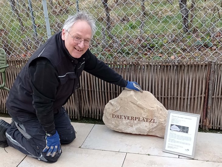 Was für ein passendes Abschiedsgeschenk von den KollegInnen: ein eigener „Ritterstein“ für Matthias Dreyer!