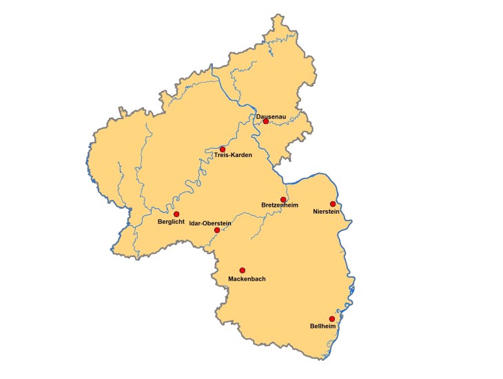 Bellheim, Berglicht, Bretzenheim, Dausenau, Idar-Oberstein, Mackenbach, Nierstein und Treis-Karden.