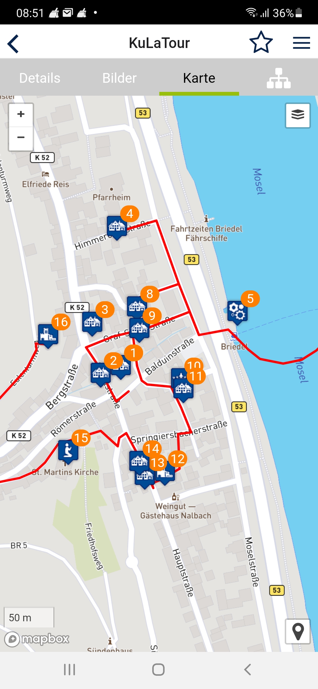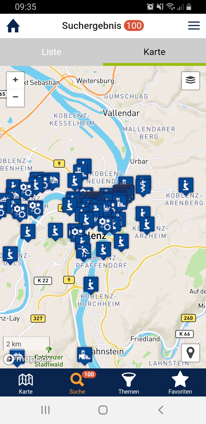 In der KuLaDig-App fällt die Karte schon stärker ins Auge, da die mobile Nutzungsweise der App ein Verorten des eigenen Standorts in der Landschaft notwendig macht, ob in der Kartenansicht zu KuLaDig-Objekten in der Nähe oder im Rahmen einer KuLaTour.