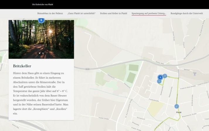 In einer Storymap lassen sich mehrere Karten integrieren. Eine Überblickskarte beispielsweise kann die Gesamtheit eines Phänomens veranschaulichen, während andere Karten dann stärker einzelne Aspekte und Fragestellungen aufzeigen. In Plaidt beispielsweise sollen alle Tuff-Abbaustellen und Einbruchstellen in der Pellenz in einer Übersichtkarte angezeigt werden. Dadurch wird deutlich, in welchem Maße die Region durch Tuff-Abbau geprägt war und heute noch ist. In weiteren Karten werden beispielsweise nur Einbruchstellen oder nur Stollensysteme im Ortskern von Plaidt angezeigt.