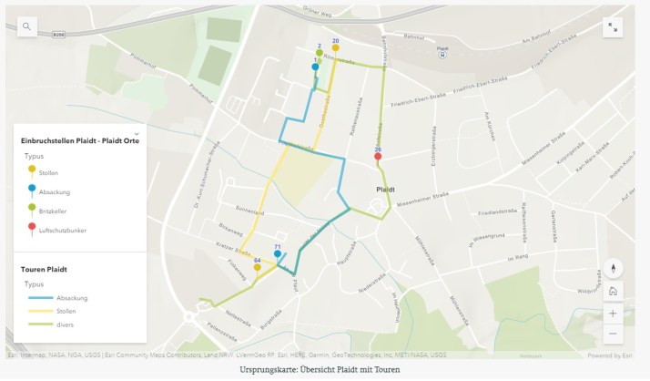 Als Forschungs- und Modellprojekt ist uns sehr daran gelegen, gemeinsam mit unseren Partnerkommunen verschiedene weitere Medien zur Wissensvermittlung zu nutzen und auszuprobieren. Aus diesem Grund wird zurzeit in Plaidt im Rahmen des Teilprojekts „Pellenz“ eine Storymap produziert. Storymaps stellen eine Kombination von kleineren Texten, Bildern, Videoclips und Karten dar, ermöglichen über Popups oder Infofenster auch orts- oder objektbezogene Informationen in der Karte zu integrieren. In den Storymaps wird auf verschiedene Kartenwerke zugegriffen, das Einarbeiten der Daten erfolgt mithilfe der Geoinformationssystem-Software ArcGIS.