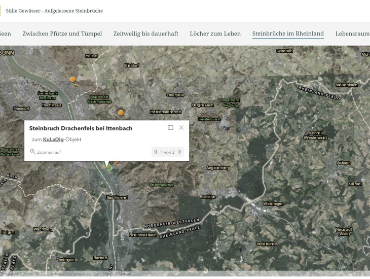 Die Storymap in Plaidt wird in diesem Jahr fertiggestellt. Finanziert wird das Produkt durch die Anschubfinanzierung des Innenministeriums von Rheinland-Pfalz und durch die Verbandsgemeinde. In KuLaDig werden unter dem Stichwort Kulturlandschaft erklärt bereits eine Vielzahl an Storymaps zu unterschiedlichen Themen bereitgestellt, die vom LVR, dem Kooperationspartner unseres Landesprojekts, erstellt wurden. Dort geht es zum Beispiel auf anschauliche wie informative Weise um aufgelassene Steinbrüche (s. Screenshot zu Beginn des Beitrags), um die Bedeutung von Streuobstwiesen, um die Vermessung des Rheins oder den Bergbau im Ruhrgebiet – Reinschauen lohnt sich!