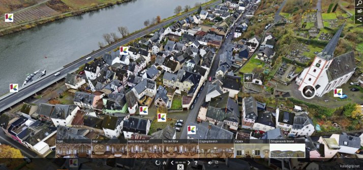 Der Moselort Briedel bewarb sich im Jahr 2020 für die Teilnahme am Landesprojekt. Es ging darum, den bereits bestehenden Datenbestand in KuLaDig einer Supervision zu unterziehen und gezielt zu ergänzen, auch medial. Neu hinzu kam der Ortsbeitrag, unter dem sich nun alle Objekte versammeln. Mithilfe der Anschubfinanzierung wurden 360-Grad-Fotografien in der Kirche und – mithilfe einer Drohne – vom Ort selbst produziert. Auf diese Weise kann der Ort nun auch interaktiv digital erlebt werden, schon von zu Hause aus, aber auch unmittelbar vor Ort.