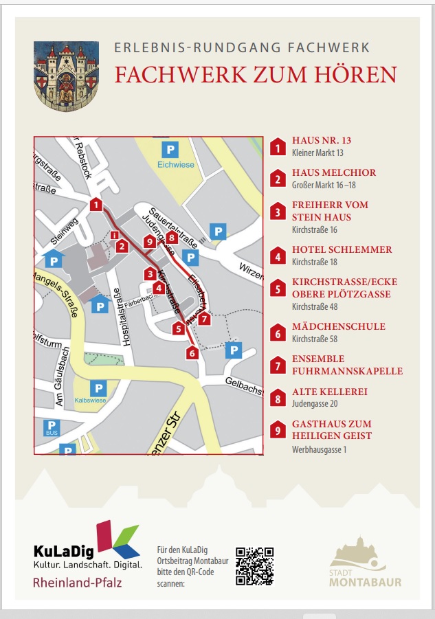 Das Gebäude Fachwerkensemble Alois-Jäger-Platz 1, das zurzeit grundsaniert wird, kann nun in einem virtuellen und interaktiven Rundgang entdeckt werden. Zudem wurden mithilfe der Anschubfinanzierung des Projekts Audios für Erwachsene und für Kinder zu jedem Gebäude produziert, beworben mit einem eigenen Flyer der Tourist-Information. Kleine Schilder an den Objekten mit QR-Codes machen die Audiodateien beim Rundgang verfügbar. Auch zwei Videos mit Thomas Becker zur Fachwerk-Restaurierung und zur Zimmererkleidung sowie das KuLaDig-Objekt Stadt Montabaur werden so angeboten. Und auch hier kann eine KuLaTour in der App für die Navigation genutzt werden.