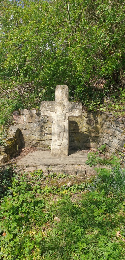 Das vielleicht rätselhafteste Relikt im Ort ist jedoch das Waldlaubersheimer Steinkreuz, unser Objekt des Monats Juli. Per Zufall wurde das Kalksteinkreuz mit der verwitterten Christusfigur auf einem Feld in der Gemarkung der Gemeinde gefunden. Schnell bildete sich um dieses Kreuz die Legende, es sei einem Ritter gewidmet gewesen, der, vom Kreuzzug aus Jerusalem kommend, hier im Ort zu Tode kam. Nachdem das Kreuz im Ort zeitweise in Vergessenheit geriet, wechselte es den Besitzer und wurde in die Nachbargemeinde Genheim verbracht, kam jedoch kurze Zeit später nach Waldlaubersheim zurück. Nach mehrfachem Besitzerwechsel gelangte das Kreuz in den Besitz des Freilichtmuseums Bad Sobernheim, in dem es sich auch heute noch befindet. Versuche der Gemeinde, das Kreuz zurückzuerhalten, misslangen und so befindet sich heute unterhalb der Kirche eine steinerne Replik. Wer wissen will, was es mit dem Kreuz noch so auf sich hat – im KuLaDig-Beitrag wurden die Erkenntnisse zusammengetragen.