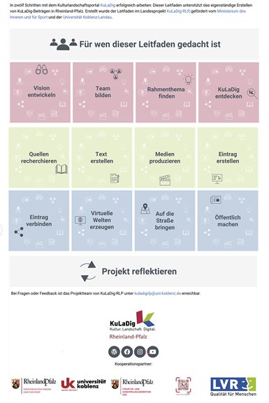 Als eine Art Quintessenz unserer Erfahrungen und Modellentwicklungen aus den ersten Projektjahren steht der Leitfaden allen Interessierten offen, die das eigene kulturelle Erbe erfassen und präsentieren möchten. Um die Arbeit mit KuLaDig möglichst umfassend und dennoch anschaulich darzustellen, haben wir sie in inhaltliche Kapitel aufgeteilt. Anhand dieser zwölf „Schritte“ kann ein KuLaDig-Projekt von der Auswahl geeigneter Themen und Objekte und der Gründung einer Arbeitsgruppe über die Datenerhebung und Medienproduktion bis hin zum Eintrag in das KuLaDig-Backend und die Sichtbarmachung vor Ort strukturiert werden. Die Kacheloptik auf der Startseite soll verdeutlichen, dass es keine festgelegten Prozesse gibt, sondern dass jedes KuLaDig-Projekt eine individuelle Herangehensweise erfordert. Prinzipiell kann an jeder Stelle der Einstieg erfolgen, je nach Bedarf, die Kacheln werden zu einem „Markt der Möglichkeiten“.