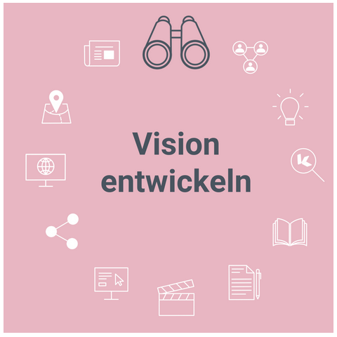 Die zwölf Kacheln sind farblich so gestaltet, dass sie die jeweiligen „Schritte“ in die drei Phasen „Konzeptentwicklung“, „Content-Produktion“ und „Verwertung im Ort“ eingeteilt werden können. Der gesamte Prozess wird in den Kacheln als Kreislauf dargestellt. Die jeweilige Phase wird in Form eines hervorgehobenen Icons anschaulich gemacht. Innerhalb der Kacheln werden die einzelnen Kapitel in einer übersichtlichen „Akkordeon-Optik“ angeboten, so dass immer nur der gerade relevante Abschnitt sichtbar ist bzw. durch Anklicken ausgeklappt werden kann.