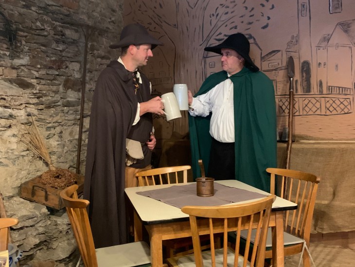 In Dausenau an der Lahn führt der Verein „Historisches Dausenau e.V.“ seit einiger Zeit ein bis zweimal pro Jahr eine szenische Stadtführung in historischen Kostümen durch. Im Rahmen dieser Veranstaltung werden an ausgewählten historischen Objekten Begebenheiten aus der Geschichte und lokale Anekdoten durch Laien nachgespielt. Diese Besonderheit sollte auch in der digitalen Wissensvermittlung im Rahmen des KuLaDig-RLP-Projekts umgesetzt werden, sodass die Stücke in Form von Videoclips langfristig und zu jeder Zeit verfügbar sind. Das lokale Projektteam verfasste den Text und stellte die Schauspieler:innen. Das studentische Team war für den Dreh verantwortlich.