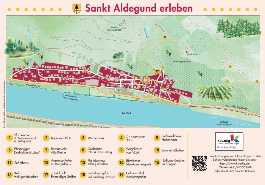 Um die digitalen Daten im Ort selbst sichtbar und bekannter zu machen, hatte sich der Moselort im letzten Jahr erfolgreich für die Verwertungsförderung durch das Landesprojekt KuLaDig-RLP mit Mitteln des Innenministeriums beworben. Wieder war es Schommers, der den Kontakt in die nahegelegene KuLaDig-RLP-Kommune Briedel aufnahm und sich durch den dort umgesetzten Themenweg „Gaugraf-Zeyzolf-Runde“ inspirieren ließ. Nun sind die Objekte, darunter das Christophorus-Haus aus dem Jahre 1473, ein Wegekreuz von 1656 und der ehemalige Dorftreffpunkt Laufbrunnen „Boa“, als Tour zusammengefasst und im Ort sichtbar.