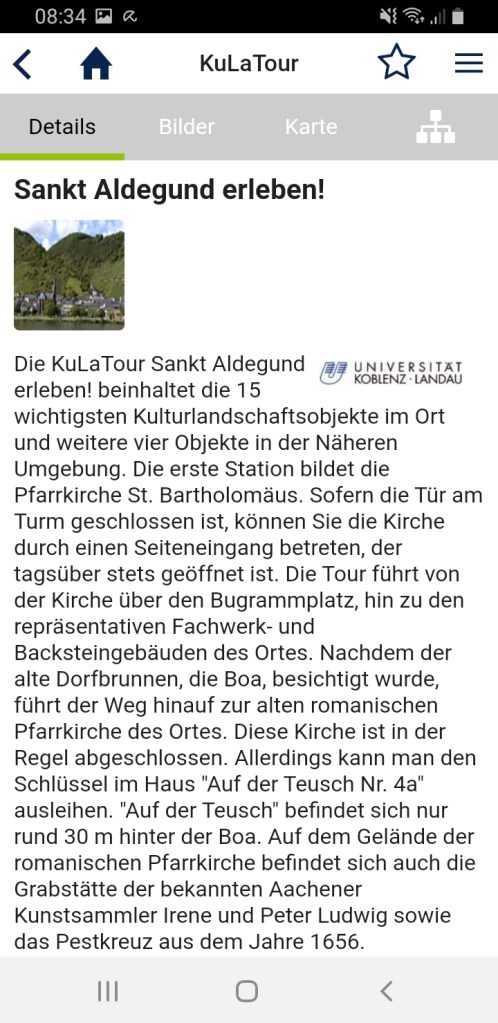 Am letzten Freitag wurde in Sankt Aldegund an der Mosel der Rundweg „Sankt Aldegund erleben“ durch Ortsbürgermeister Günter Treis im Beisein vieler interessierter Menschen aus dem Ort und der Umgebung eröffnet. Auf diese Weise fand auch die Förderung Sankt Aldegunds durch das Landesprojekt KuLaDig-RLP seinen Abschluss. Für das KuLaDig-RLP-Team nahm Florian Weber teil und dankte auch im Namen der Kolleg:innen, Projektleiter Prof. Dr. Michael Klemm und Christine Brehm, für die gute Zusammenarbeit.