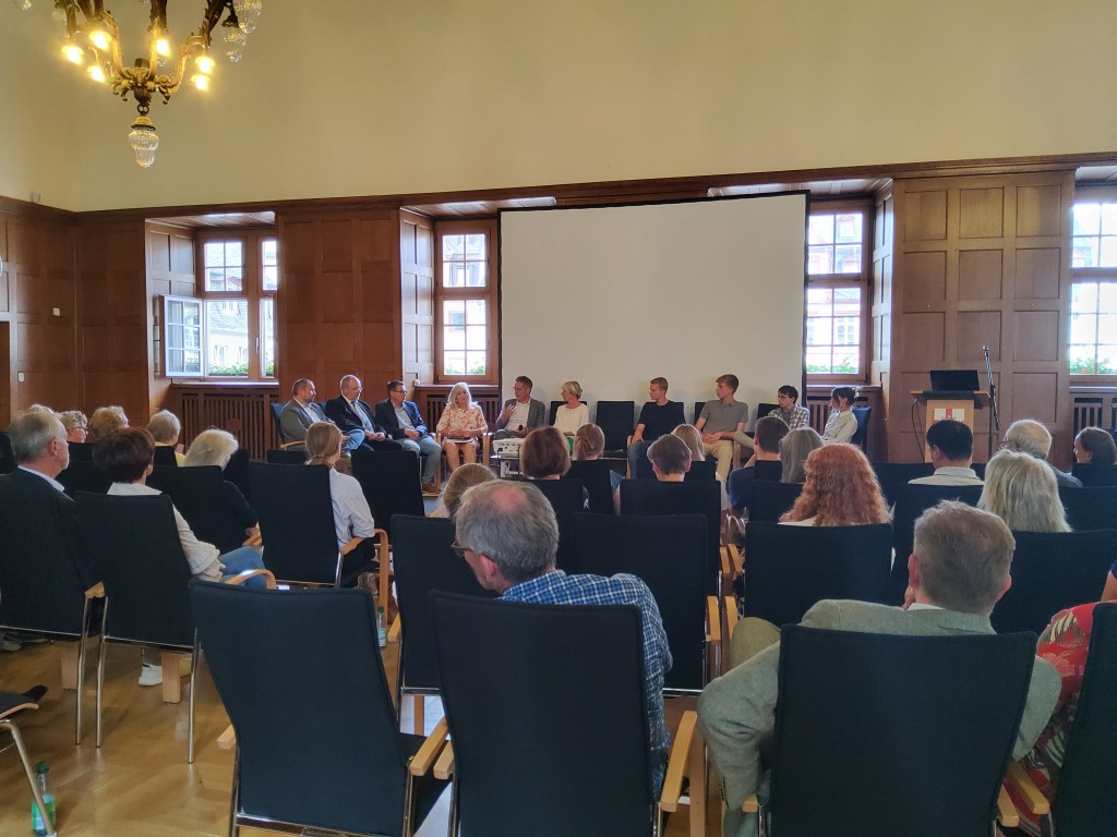 Schüler:innen der beiden Koblenzer Gymnasien im Gespräch mit den Fachleuten und die Zeitzeugin Roswitha Verhülsdonk.