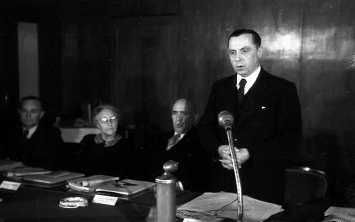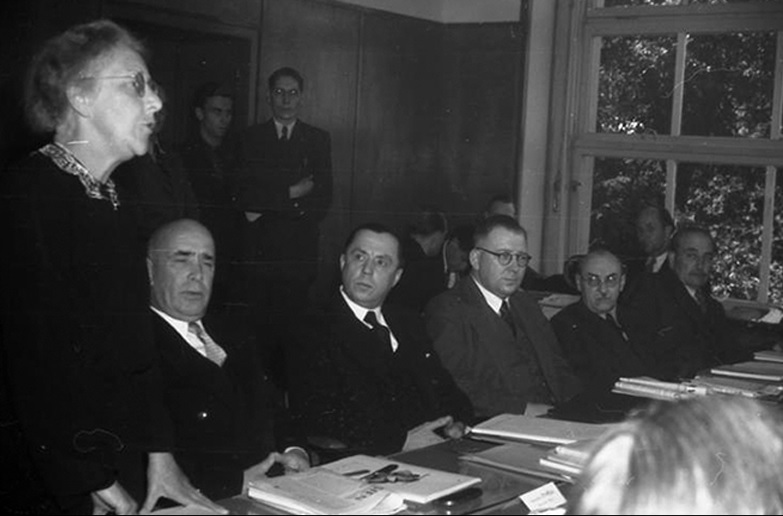 Teilnehmer:innen der Konferenz: Peter Altmeier, Ministerpräsident von Rheinland-Pfalz, Oberbürgermeisterin Louise Schroeder von Berlin und ein Blick über den Konferenztisch (1948, Quelle: Bundesarchiv).