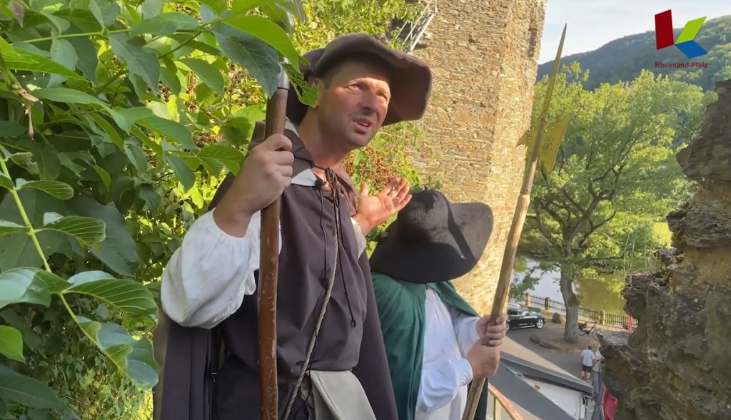 In unserem Landesprojekt haben wir bereits in verschiedenen Teilprojekten mit Spielszenen (und zugegebenermaßen einer gewissen künstlerischen Freiheit und manchem Augenzwinkern) an historischen Personen angeknüpft, ohne dabei konkrete historische Ereignisse nachzustellen (beispielsweise die beiden mittelalterlichen Torwächter in Dausenau oder ein Video zur Kamillen-Traud in Kelberg).