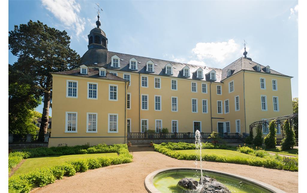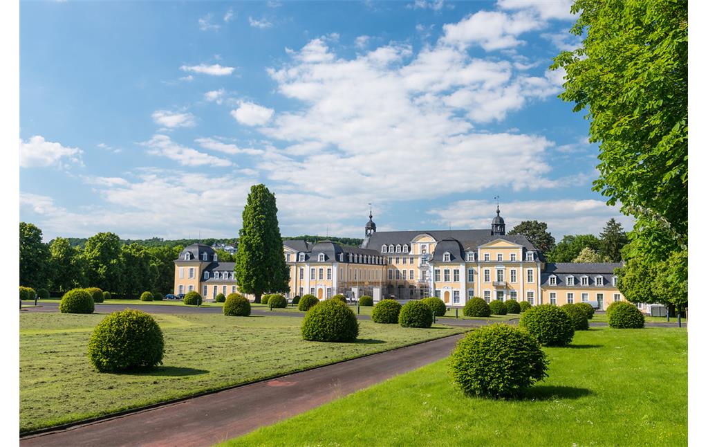 Ansicht des hinteren, der Lahn zugewandten Gebäudeteils von Schloss Oranienstein in Diez. Der kleinere Garten läuft spitzwinklig zu (2013)