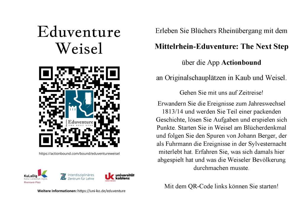 Zwei Eduventures, sprich digitale Schnitzeljagden, zu diesem Thema wurden für die Orte Weisel und Kaub erstellt und können bereits gespielt werden, in dem man die QR-Codes an den beiden Blücher-Denkmälern scannt oder die KuLaDig-Beiträge dazu aufruft – dort sind die Bounds in der Mediengalerie verlinkt. Um das Spiel aus Nutzer:innen-Sicht kennenzulernen, begaben sich die Redakteurin des Koblenzer SWR-Studios Christina Hover und Dr. Peter Ferdinand, Geschäftsführer des Interdisziplinären Zentrums für Lehre (IZL) und Leiter des Projekts, nach Kaub. Mit von der Partie war Dieter Weber, als Leiter des Blücher-Museums in Kaub versierter Kenner der damaligen Ereignisse. Bei der unterhaltsamen Exkursion entstand ein Beitrag für die Hörer:innen des Kulturradios SWR2, der am 25. Oktober in der Sendung „Journal am Mittag“ überregional ausgestrahlt wurde.