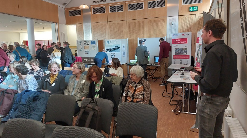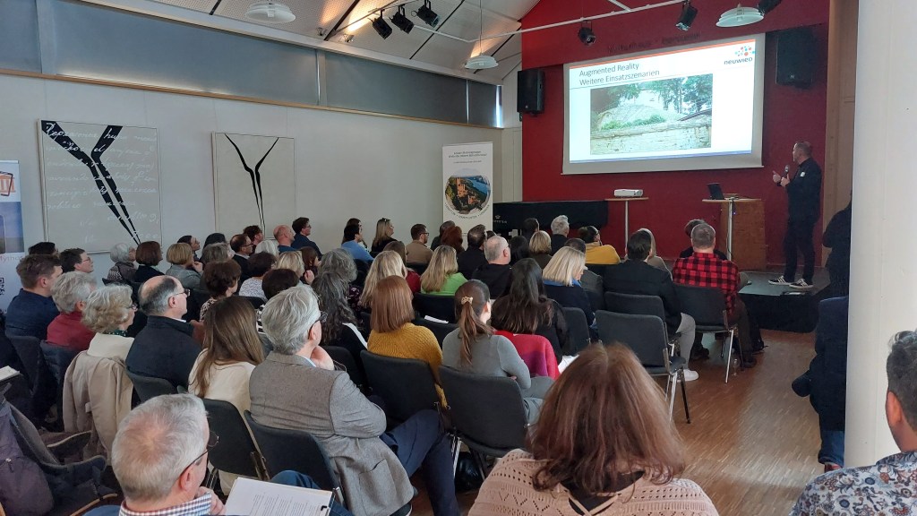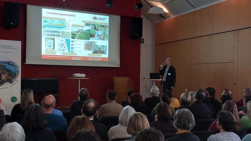 Ausgerichtet wurde die für alle Interessierten kostenlose Informationsveranstaltung von der LAG Welterbe Oberes Mittelrheintal – und die traf dabei auf großes Interesse im proppevollen Kulturhaus Oberwesel. In Form kurzer Präsentationen stellten die acht Anbieter ihre Anwendungen in einem ersten Teil vor. Projektleiter Prof. Dr. Michael Klemm präsentierte das Landesprojekt und gab einen Überblick über einige unserer Best-Practice-Modelle. Besonders der Citizen-Science-Aspekt des Projekts und und die langfristige Zusammenarbeit mit dem KuLaDig-Portal mit seinen 15.000 Objekten des kulturellen Erbes – 100 davon alleine in Oberwesel – standen im Fokus. Deutlich wurde, das man auch mit geringem Kostenaufwand, aber viel Kreativität, Engagement und Herzblut beeindruckende Ergebnisse erzielen und vielfältige Wissensformate entwickeln kann. Dr. Peter Ferdinand vom Interdisziplinären Zentrum für Lehre (IZL) der Universität Koblenz regte beim Vorstellen des Mittelrhein-Eduventure-Projektes mit seinen vielfältigen Multimedia-Einbindungen (in Actionbound sind virtuelle 360-Grad-Räume und aufwändige Mixed-Reality-Animationen eingebunden) zum Nachmachen an und traf damit bei vielen Besucher:innen auf reges Interesse.