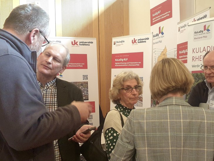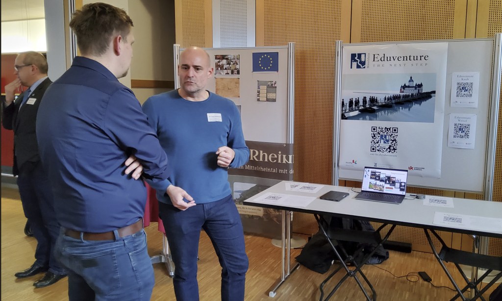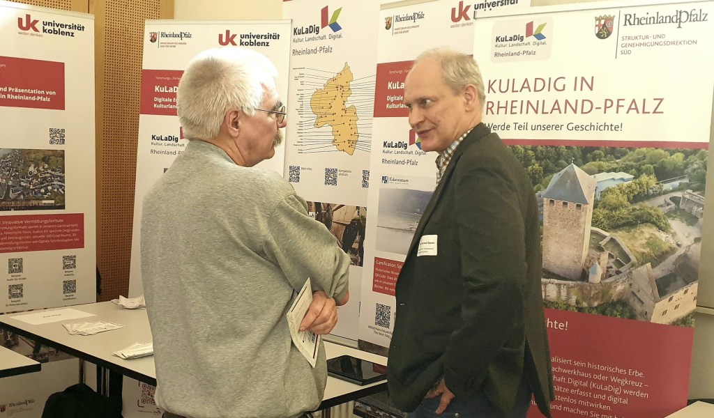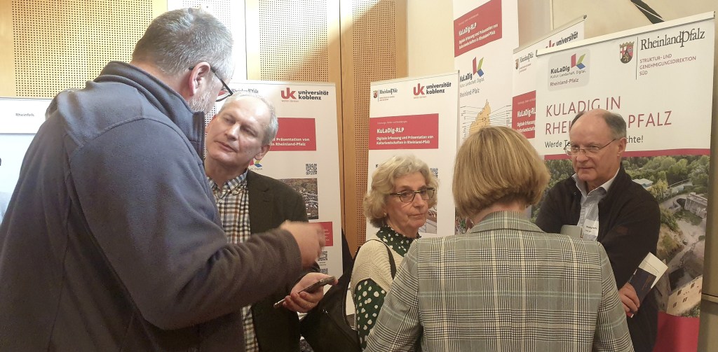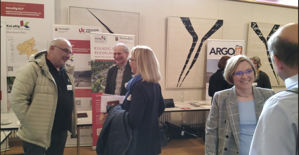 Im zweiten Teil der Veranstaltung gab es Zeit für den persönlichen Austausch, ein Kennenlernen der digitalen Umsetzungen und zum Vernetzen beim „Markt der Möglichkeiten“. KuLaDig-RLP und das KuLaDig-Kompetenzzentrum hatten jeweils einen Stand, ebenso wie das Mittelrhein-Eduventure-Projekt. Auch der neue Kooperationspartner ARGO war anwesend und präsentierte seine eindrucksvollen Umsetzungen im Bereich von 3D-Rekonstruktionen.