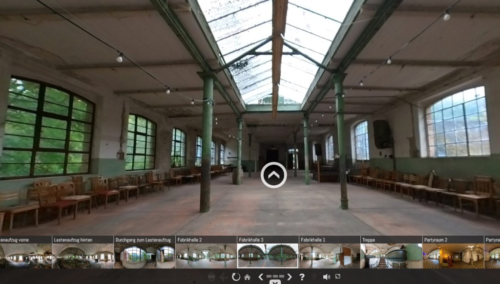 Screenshot der 360-Grad-Tour durch die ehemalige Wollfabrik, hier aus dem Inneren einer der Produktionshallen.