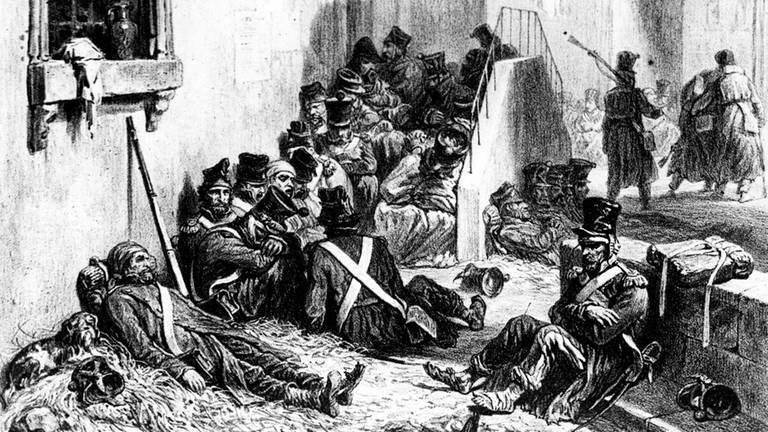 Der Zeichner Auguste Raffet zeichnete ein realistischeres Bild der Soldaten der Zeit. Die ausgemergelten und verlumpten Figuren, hier Franzosen, litten am sogenannten Fleckfieber, das die Soldaten in Europa verbreiteten und an dem auch in Kaub und Weisel einige Menschen starben.