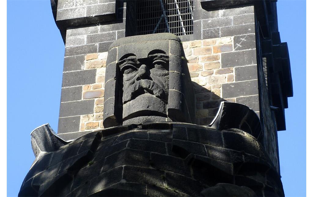 Detail der Darstellung des „Eisernen Kanzlers“ Otto von Bismarck als Rolandsfigur in Ritterrüstung am Bismarckturm in Köln-Marienburg (2020).