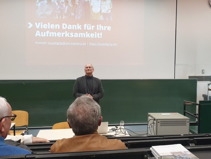 Zuvor hatte Michael Klemm in einem öffentlichen Abendvortrag mit dem Titel „Lokal- und Regionalgeschichte digital und multimedial erlebbar machen: Einblicke ins Landesprojekt KuLaDig Rheinland-Pfalz“ den Mitgliedern und weiteren Interessierten an der Universität Mainz die Zielsetzung des Citizen-Science-Projekts und einige Ergebnisse wie die entwickelten Formate der Wissensvermittlung vorgestellt. Die Mainzer Region ist bislang noch nicht so sehr unter den Modellkommunen vertreten – das durchaus Interesse besteht, zeigten die vielen Nachfragen am Ende des Vortrags und beim kleinen Umtrunk im Anschluss.