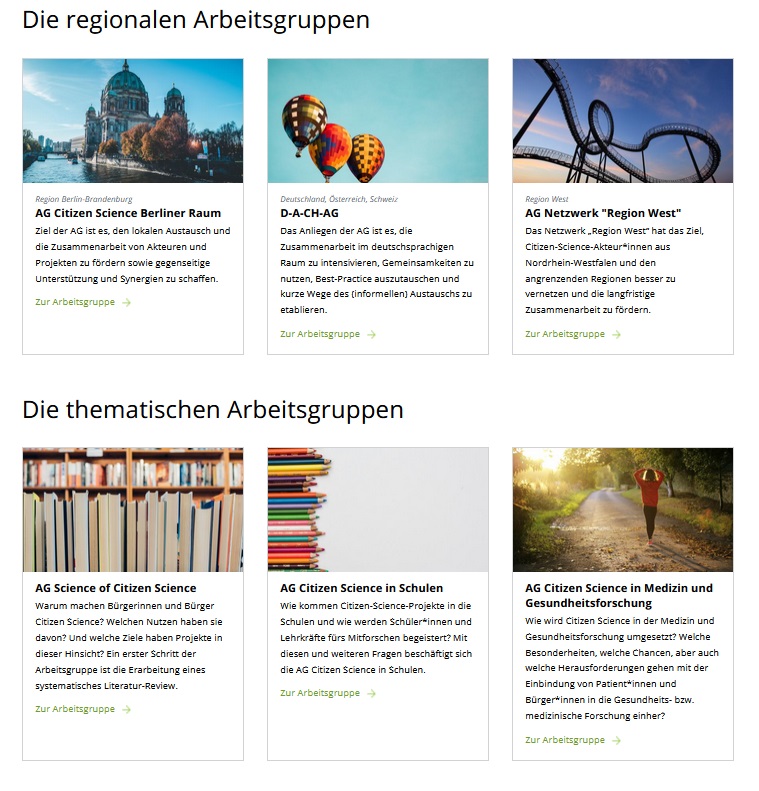 Screenshot der Übersichtsseite zu den verschiedenen Arbeitsgruppen des mitforschen!-Netzwerks