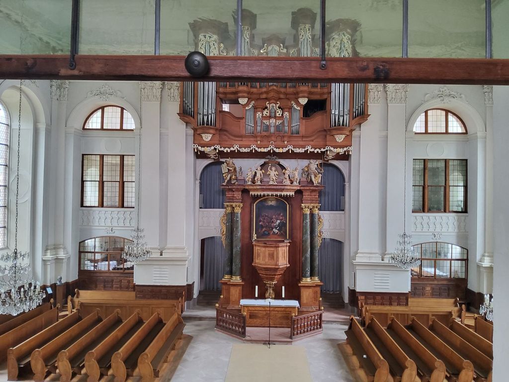 Orgeltisch der Stumm-Orgel von 1745, auf der Mozart spielte (links) und das eindrucksvolle Gehäuse der Stummorgel als Teil des Kanzelorgelaltars in der Paulskirche, von der Fürstenloge aus gesehen (rechts).