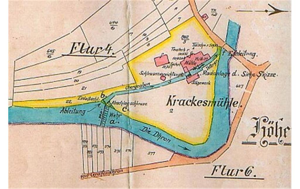 Kurzzeitig befanden sich die Mühlenrechte in der Hand des Staates, bevor sie 1999 wieder auf die Krackesmühle rückübertragen wurden. Anhand alter Pläne und Flurkarten der 1920er Jahre erläutert Petry, wie die Mühle einst genutzt wurde, welche Rechte ihr gegeben waren und wo sich die Mühlräder befanden. Betrieben wurden unter einem Dach eine Öl-Mühle, eine Mahl-Mühle und ein Sägewerk, alles mittels einzelner Wasserkanäle mit dem Wasser der Dhron versorgt und angetrieben.