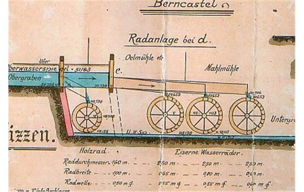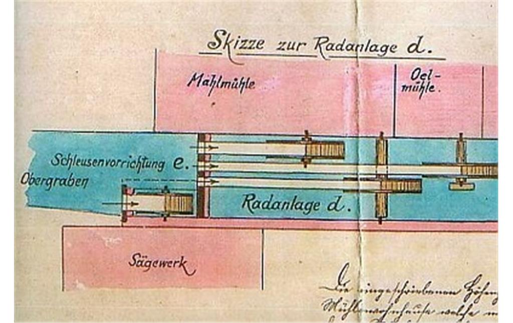Situationspläne aus den 1920er Jahren verdeutlichen (von links nach rechts) die Lage des Mühlenkomplexes, die einzelnen Gebäude sowie die Wasserführung über Kanäle und Schleusen zu den verschiedenen Mühlrädern.