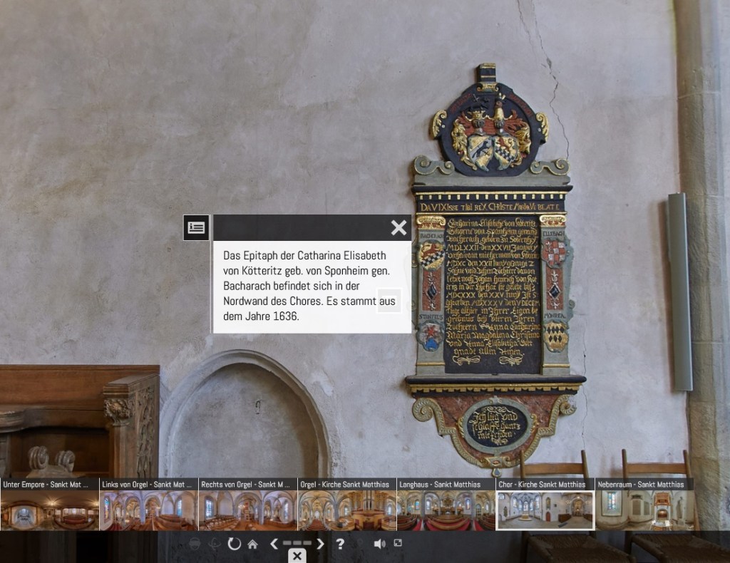 Zu ausgewählten Objekten werden Informationen in Textboxen geliefert, hier die Grabplatte der Catharina von Kötteritz.