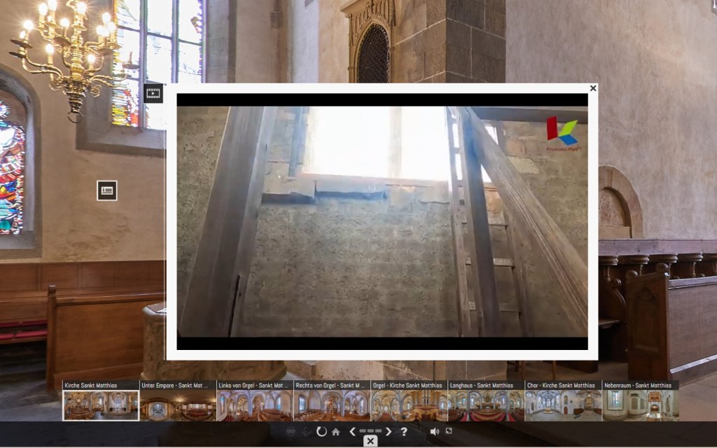 Screenshot des Videoplayers Aufstieg zum Grabturm im virtuellen 360-Grad-Raum der Matthiaskirche.