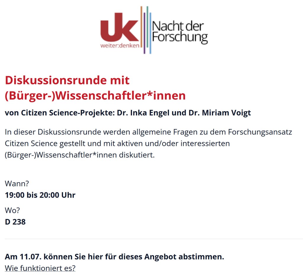 Wir laden alle Interessierten herzlich ein, am 11. Juli die Nacht der Forschung an der Universität Koblenz zu besuchen und bei der Diskussionsrunde in D 238 zum Thema „Bürgerwissenschaften“ mitzudiskutieren.