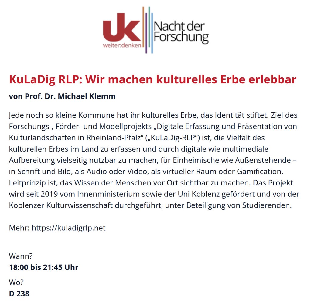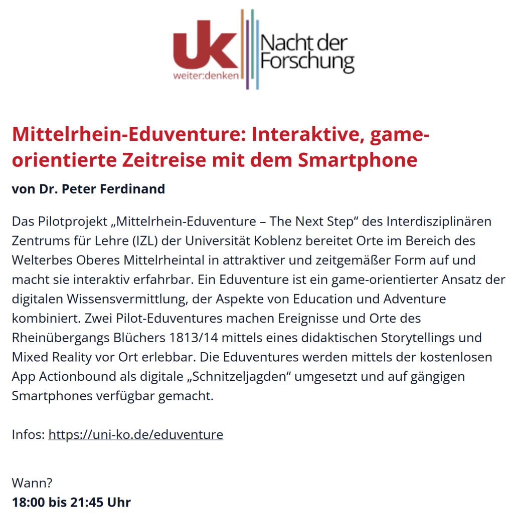 Unser Landesprojekt und das Pilotprojekt „Mittelrhein-Eduventure – The Next Step“ beteiligen sich im Rahmen eines gemeinsamen Stands mit allen Citizen-Science-Projekten der Universitär im Raum D 238 an der Nacht der Forschung. Wir präsentieren nicht nur unsere Ergebnisse, sondern lassen auch mit uns kooperierende Bürgerwissenschaftler:innen zu Wort kommen. Wie sieht Bürgerwissenschaft im Bereich der Kulturvermittlung und des kulturellen Erbes heutzutage aus und welche Faktoren begünstigen und behindern das Engagement der Akteure? Diese und weitere Fragen werden die geladenen Bürgerwissenschaftler:innen gemeinsam mit Fachleuten aus der Uni und mit interessierten Personen aus dem Publikum erörtern.