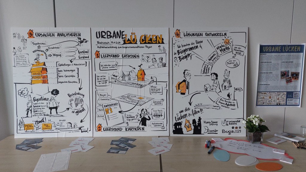 Engagierte Diskussionen auch an den Ständen der anderen Projekte: links das Liebesbriefarchiv, rechts „Urbane Lücken“ zur Situation des Leerstands im Oberen Mittelrheintal