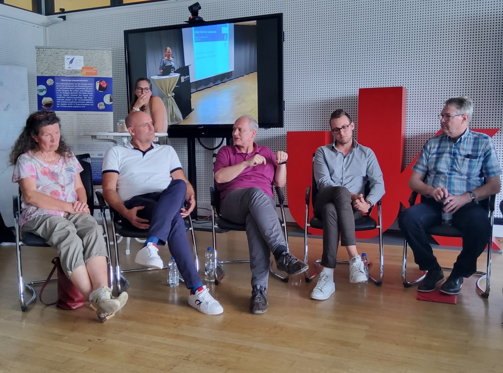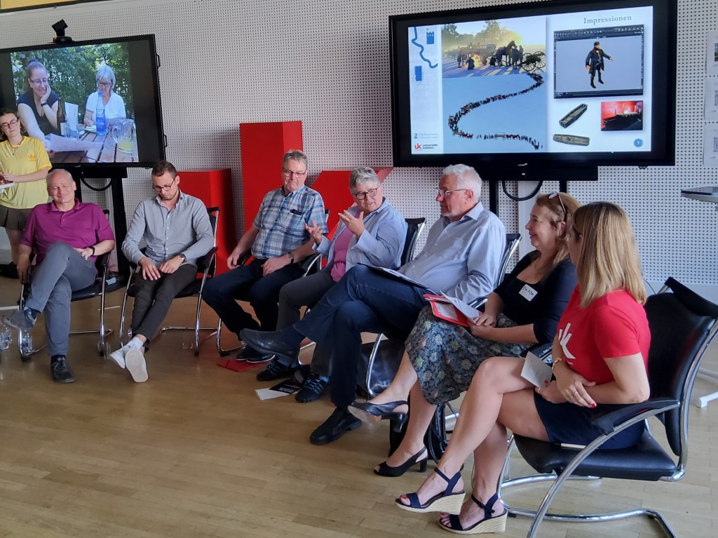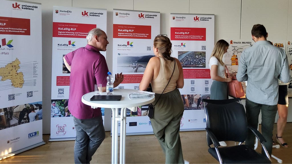 Im Mittelpunkt der Veranstaltung stand eine Podiumsdiskussion um die Bedeutung der Bürgerwissenschaften für alle Beteiligten und die Gesellschaft. Hier kamen – moderiert von Transfermitarbeiterin Dr. Miriam Voigt, die selbst im Projekt „Urbane Lücken“ mitarbeitet – neben den Projektleiter:innen auch einige Bürgerwissenschaftler:innen zu Wort. Anette Marciniak-Mielke, Ortsbürgermeisterin von Helferskirchen im Westerwald, stellte zusammen mit Museumsleiter Paul Müller das schon vor zehn Jahren begonnene Oral-History-Video-Projekt zu den Gewerken und Bräuchen des Ortes vor, das 2020 durch KuLaDig-RLP unterstützt wurde. Wilfried Radloff erzählte von seinen Bemühungen, das Wissen um den Dachschieferbergbau in Kaub „für die Ewigkeit“ aufzubereiten – seit dem letzten Jahr betreibt er sogar ein Museum im Ort, nun auch mit zehn Videos, die im Landesprojekt entstanden sind. Dr. Margit Göttert berichtete von ihrem Leben zwischen wissenschaftlichem Beruf und Citizen Science im Heimatort Weisel – hier sind in der ehrenamtlichen Arbeit eines historischen Vereins in den letzten Jahren einige Bücher entstanden. Und die Mitarbeit am Mittelrhein-Eduventure brachte sogar die Nachbarorte Kaub und Weisel zur engagierten Zusammenarbeit.