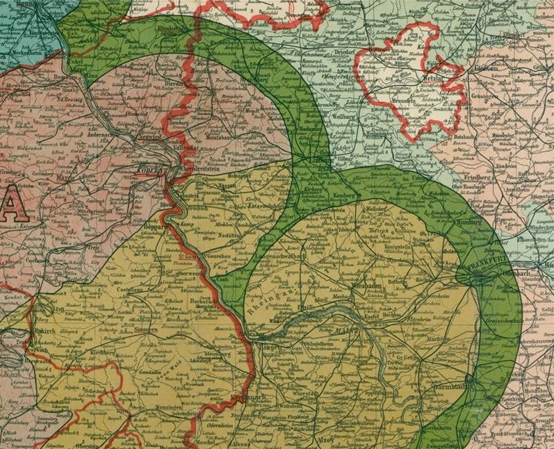 Unser Objekt des Monats ist dieses Mal kein physisches Objekt, sondern eine historische Skurrilität: Nach dem Waffenstillstand von 1918 besetzten amerikanische, britische und französische Truppen deutsches Gebiet westlich des Rheins und begannen, die einzelnen Gebiete in Besatzungszonen aufzuteilen. Dabei wurden drei halbkreisförmige Brückenköpfe mit einem Radius von 30 km um Köln (britische Zone), Koblenz (amerikanische Zone) und Mainz (französische Zone) errichtet. Das Kriegsende kam für die Alliierten schneller als erwartet und so sah man sich aufgrund der drängenden Zeit genötigt, eine rasche Aufteilung in die Besatzungszonen vor – und ein paar Ungenauigkeiten in Kauf zu nehmen.