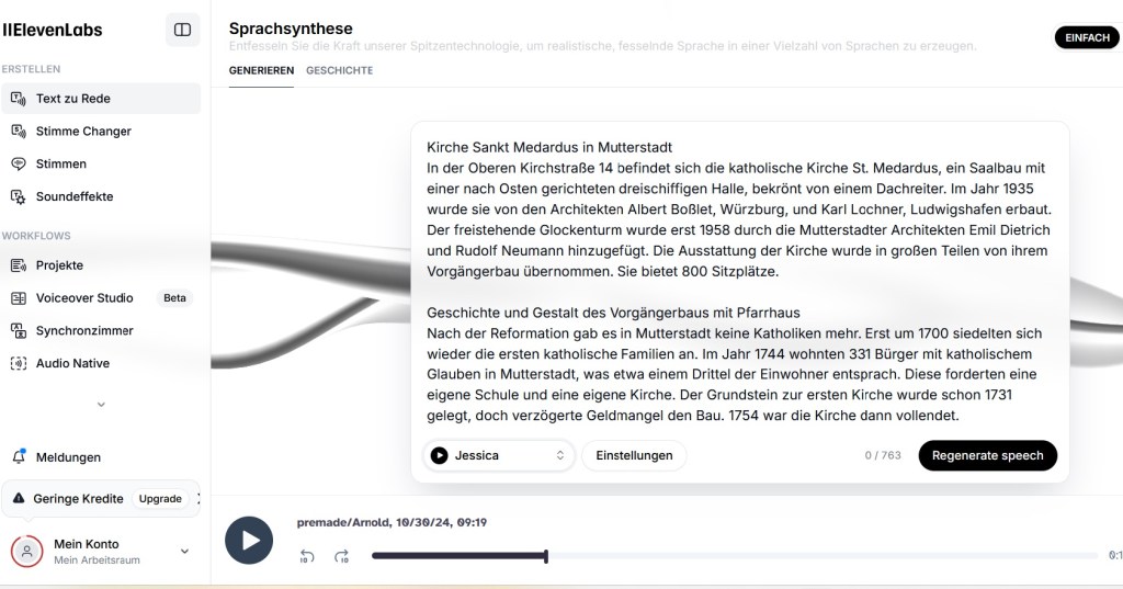 Die Informationsvermittlung setzt verstärkt auf Audiovisualität, da immer weniger Menschen bereit sind, lange Texte zu lesen, aber auch aufgrund erhöhter Anforderungen an Barrrierefreiheit von Websites etwa für sehbehinderte Personen. Insbesondere Audios erfreuen sich in unseren Teilprojekten großer Beliebtheit, da man zum Beispiel parallel zum Hören mit seinen Blicken die Umgebung erkunden kann. Ein Effekt, den man bereits von Audio-Guides aus Museen kennt und schätzt. Nun kann man mit dem Diktiergerät des eigenen Smartphones bereits gute Audios erstellen. Unsere Partner in Herxheim beispielsweise produzieren bei ihrem Grabstein-Projekt eine Vielzahl wunderbarer Audios, ganz ohne KI. Wenn man aber den Weg mit KI gehen möchte, gibt es dafür kostenfreie Möglichkeiten, wenn man nicht – wie in unserem Projekt – vorhandene Lizenzen wie etwa ein Adobe-Paket nutzen und ein Audio mit Adobe Audition, einer Software zur Bearbeitung von Audiodateien, produzieren kann. So haben wir zum Beispiel Audios für die Kirche Sankt Medardus in Mutterstadt mit künstlicher Stimme generiert.