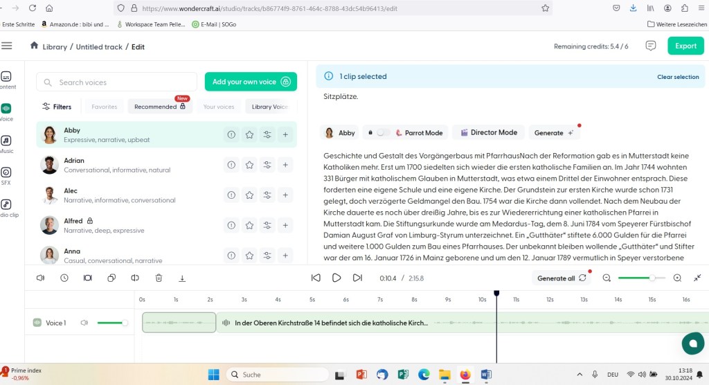 Ganz ähnlich verhält es sich mit der Anwendung Wondercraft. Auch diese kann man in der Testversion nutzen, um mit KI-Stimmen (in diesem Fall die KI Abby) Texte in Audiodateien umzuwandeln.