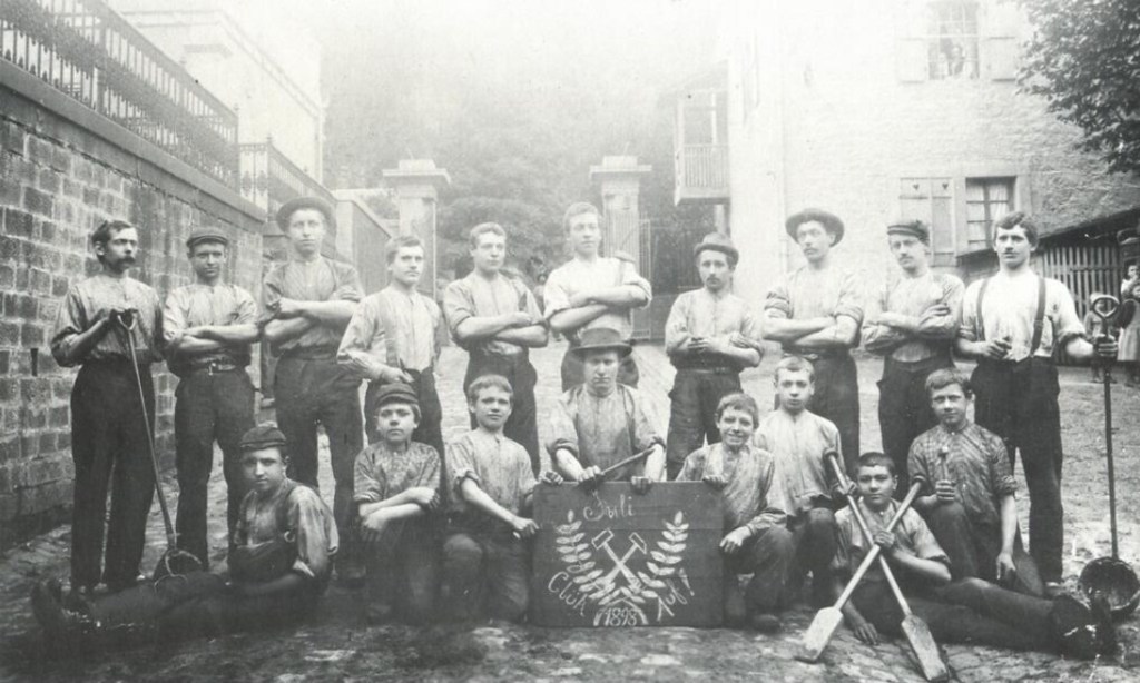 Dass Kinderarbeit um 1900 nicht nur in den Kauber Dachschieferstollen, sondern auch in der pfälzischen Eisenverhüttung völlig normal war, bezeugt ein zweites Arbeiterporträt aus dem Eisenwerk Gienanth in Eisenberg. Dieses im Jahr 1898 – eine genaue Datierung erlaubt die Tafel in der Mitte der Gruppe – geschossene Foto, zeigt die Former des Eisenwerks mit ihren Lehrjungen. Former waren dafür zuständig die in größeren Eisenwerken benötigten Gussformen herzustellen. Sicherlich ein besserer Beruf, als die Arbeit in den Kauber Bergwerksstollen. Aber dass diese Jungen, manch einer könnte gut 12 bis 14 Jahre alt sein, in eine im Vergleich zu heutigen deutschen Kindern völlig andere Kindheit und Lebenswelt besaßen, ist unbestreitbar und lässt sich durch solch wertvolle Bilder gut ablesen.
